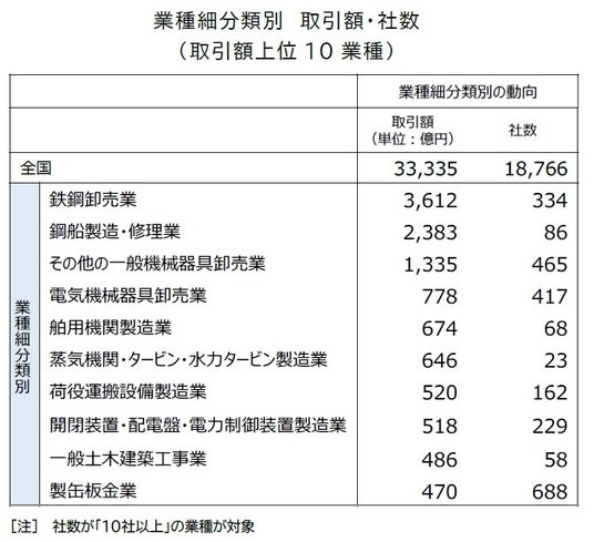 取引額で最も多いのが「鉄鋼卸売業」(334社)で、3612億円を占めた。「鋼船製造・修理業」(86社、2383億円)は、頂点企業から3~4万トンクラスの中小型船の建造を受注する企業がみられた。