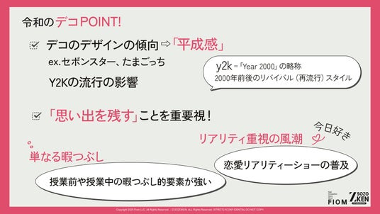 Z世代に特化したクリエイティブカンパニーFiom合同会社(本社:東京都渋谷区、代表社員:竹下洋平)が運営しているZ世代の実態や価値観を分析するシンクタンク、Z-SOZOKEN(Z世代創造性研究所)は、2026年3月18日(水)にZ-SOZOKEN THINKTANK 最新調査研究レポートの第3弾として『Z世代のデコ文化』についての調査研究レポートの第8章インサイトサマリー「令和版デコPOINT!」をリリースしました。
