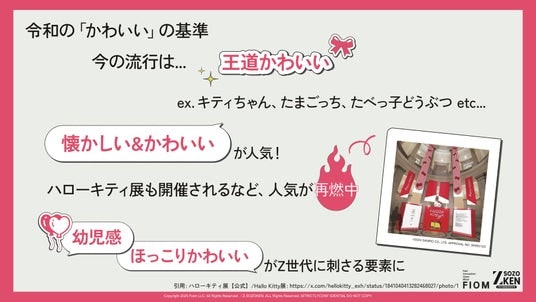Y2K(2000年代テイスト)の流行を背景とした「平成感」や、キティちゃん・たまごっちなどに代表される「王道かわいい」「幼児感」など、当時のリアルを知らないZ世代がなぜこれらに“エモさ”を感じるのか、そのインサイトを解き明かします。