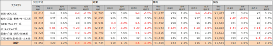 職種別の平均時給について、「事務・オフィス系」は1,616円(前年比44円増、前月4円減)、「販売・営業・飲食・サービス系」は1,583円(前年比37円増、前月比8円増)、「WEB・クリエイター系」は1,843円(前年比11円増、前月比±0円)、「IT・エンジニア系」は2,222円(前年比86円減、前月比29円減)、「医療・介護・研究・教育系」は1,728円(前年比81円増、前月比3円減)、「工場・軽作業・物流・土木系」は1,430円(前年比31円増、前月2円増)となりました。