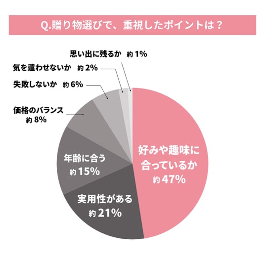 回答者に「贈り物選びで、特に重視したポイントは?」と質問したところ、「本人の好み・趣味に合っているか」(約47%)が突出して高い結果となりました。