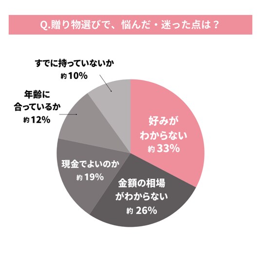 回答者に「贈り物選びで、悩んだ・迷った点は?」と質問したところ、最も多かった悩みは「好みがわからない」(約33%)。次いで「金額の相場がわからない」(約26%)となりました。