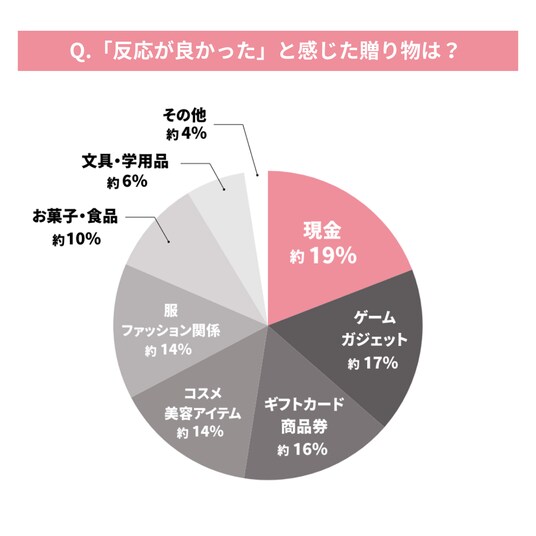 回答者に「比較的「反応が良かった」と感じたのはどんな贈り物でしたか?」と質問したところ、「現金」(約19%)が最多となり、「ゲーム・ガジェット」(約17%)、「ギフトカード・商品券」(約16%)が続きました。