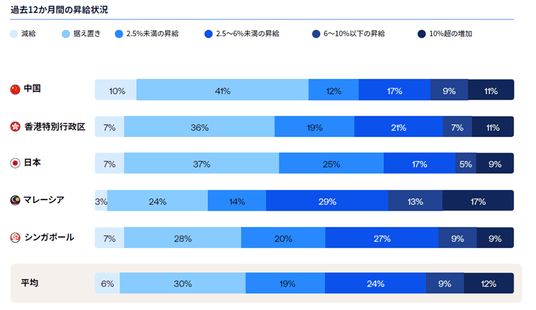 ・過去12か月における昇給において、「減給」は中国が最も多い10%。一方で、6%以上の昇給はマレーシアが最も多い(30%)、中国(20%)、香港(19%)、シンガポール(18%)、日本(14%)となっている。(図4)