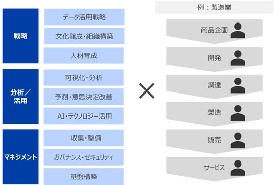 2. 分析/活用:データ活用において基本となる可視化や分析を適切に行っているか、データを用いて予測や意思決定改善などのビジネス上の価値創出が進んでいるか、AIなどのテクノロジー活用度合いなど