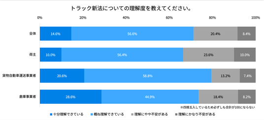 - 物効法とトラック法については全体で約8割、トラック新法についても7割超が「十分・概ね理解できている」と回答。