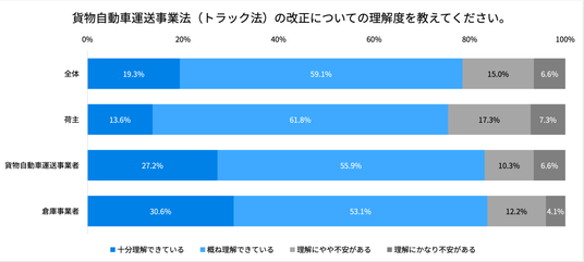 物効法、トラック法、トラック新法の3つの法改正について、それぞれの理解度を伺いました。物効法は全体の78.8%、トラック法は全体の78.4%が「十分・概ね理解できている」と回答しました。一方、内容によって施行時期が未定の部分もあるトラック新法についてはその割合がやや下がったものの、71.2%の方が「十分・概ね理解できている」と回答しています。「理解にやや不安がある」「理解にかなり不安がある」と回答した方のコメントも一部ご紹介します。
