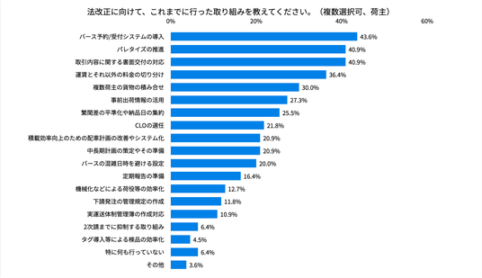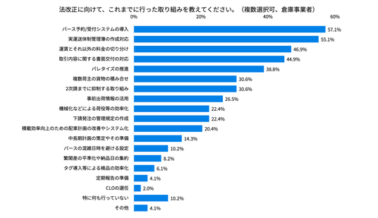 倉庫事業者では、荷主企業と同様に「バース予約/受付システムの導入」がトップでした。57.1%と多くの方が自社で取り組んでいると回答しており、拠点を持つ業種の問題意識がうかがえます。「実運送体制管理簿の作成対応」も55.1%が取り組んだと回答しており、倉庫事業者であっても運送業としての一面を持つ企業が少なくなく、トラック法の影響もあったと読み取れます。
