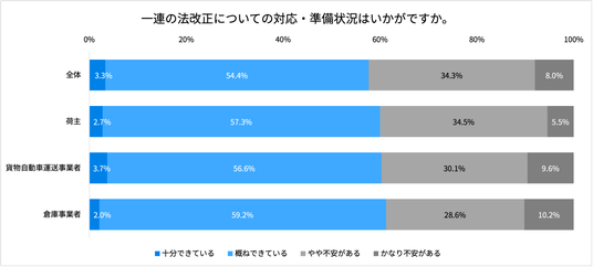 - 法改正への対応・準備状況について、全体の4割超が「やや・かなり不安がある」と回答。