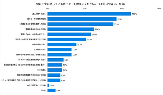 法改正への対応・準備状況について尋ねたところ、全体で4割超の方が「不安がある」(やや不安がある:34.4%、かなり不安がある:8.0%)と回答しました。「不安がある」と回答した方に特に不安に感じているポイントを伺うと、44.8%が「適正原価への対応」と答えました。次いで「荷待ち・荷役時間の短縮」が37.1%、「2次請けまでとする努力義務への対応」が35.3%でした。物流費に直接影響を与える「適正原価」の制度ですが、水準や、具体的にいつから開始されるかが未定のため不安に感じている方が多いようです。コメントも併せてご紹介します。
