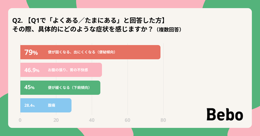- その症状は「便の出にくさ(79%)」 だけでなく、「張り・不快感(46.9%)」 、「便のゆるみ(45%)」や「腹痛(28.4%)」 など身体的な苦痛を伴っています。