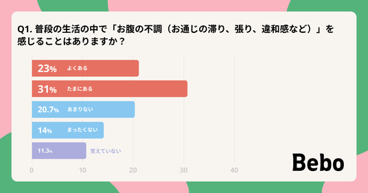 そこで『Bebo』を提供するエムボックスでは、春という環境変化の多い時期における体調の実感を切り口に、お腹の不調がどのように現れているのか、その実態を明らかにすることを目的に調査を実施しました。 また、こうした一時的な変化に直面した際、自分の体調に合わせて「微調整」できるケアを取り入れる重要性について、消化器内科医の解説とともにご紹介します。