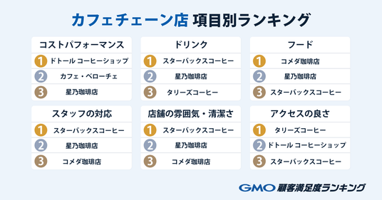 項目別ランキングでは、スターバックスコーヒーが「ドリンク(メニューの充実度や味など)」「スタッフの対応」「店舗の雰囲気・清潔さ」の項目において最多3冠を達成しました。