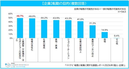 転勤がある企業の採用担当者に、転勤制度を取り入れている目的を聞くと、「人員調整(欠員補充・注力ポジションの拡充など)」が48.7%で最多となった。