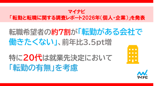 株式会社マイナビ(本社:東京都千代田区、代表取締役 社長執行役員:粟井俊介)は、20~50代の転職を希望している正社員と企業の中途採用担当者を対象に実施した、「マイナビ 転勤と転職に関する調査レポート2026年(個人・企業)」の結果を発表しました。今年で2回目の調査となります。