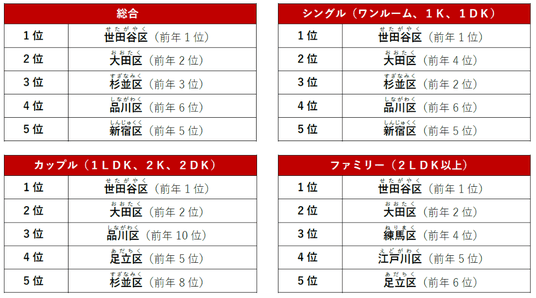 ■東京23区でPV数が多い街 総合1位 「世田谷区」総合1位は前年に引き続き「世田谷区」、2位は「大田区」で、全てのタイプでトップ2を獲得しました。住環境や交通利便性など、多様な街の魅力が評価され、幅広い層から支持を集めたようです。