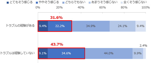 トラブルの経験別に旅行時の安心感についても分析したところ、「とてもそう感じる」または「ややそう感じる」と回答した割合はトラブルの経験がある人においては31.6%とトラブルの経験がない人に比べて割合が少なくなり、旅行時に安心感を感じていない傾向がみられました。