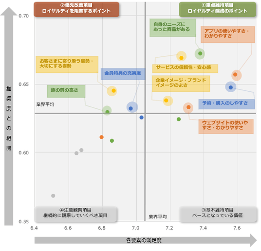 一方で、優先的に改善が求められる項目としては、「お客さまに寄り添う姿勢・大切にする姿勢」、「会員特典の充実度(割引、限定パッケージやプラン、優待など)」や、「旅の質の高さ(現地を含めたスタッフの対応、品質や内容など)」となりました。