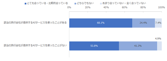 AIの活用経験別に、該当の旅行会社が提案したりおすすめした内容が自身の好みや希望に合っていると感じるか分析したところ、「該当の旅行会社が提供する、AIサービスを使ったことがある」と回答した人における「とても合っている・比較的合っている」と回答した割合は68.1%となり、それ以外の回答者に比べても高い傾向がみられました。