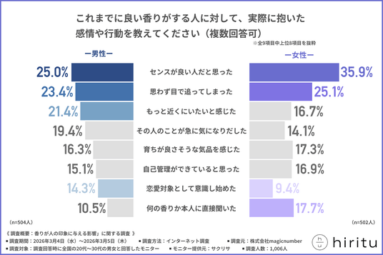 株式会社magicnumber(本社:東京都港区)は、全国の20代~30代の男女を対象に、「香りが人の印象に与える影響」に関する調査を行いました。