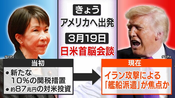 3月18日夜、高市首相は就任後初めてアメリカへ出発し、19日には日米首脳会談に臨む予定です。