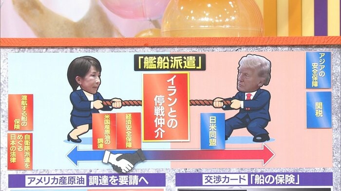 日本が持つ交渉のカードは、「対米投資やレアアース連携などの経済安全保障」「渡航する船の保険」「自衛隊派遣をめぐる日本の法律」「米国産原油の調達」などです。