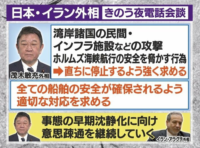 茂木外相は17日午後10時、イランのアラグチ外相と電話会談を行い、ホルムズ海峡で日本を含むすべての船舶の安全が確保されるよう、適切な対応を求めました。