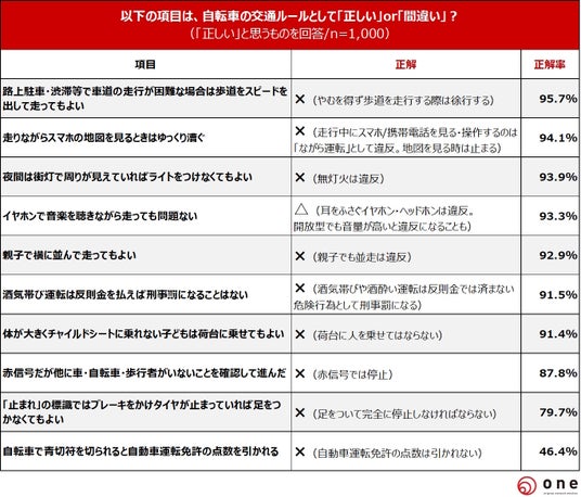 マーケティング支援事業を手掛ける株式会社one(本社:東京都新宿区、代表取締役CEO:清水佑介)は、2026年3月11日(水)~3月13日(金)の3日間で、全国の16歳以上の男女で週3日以上自転車を利用する方1,000人を対象に「自転車交通ルールに関する意識・実態調査」を実施しましたので発表いたします。