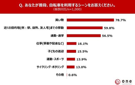 本調査の対象者である「週3日以上自転車を利用する方」が普段自転車を利用するシーンは「買い物」78.7%が最多で、以下「近くの目的地(例:駅、役所、友人宅)までの移動」59.8%、「通勤・通学」56.5%が上位となりました。