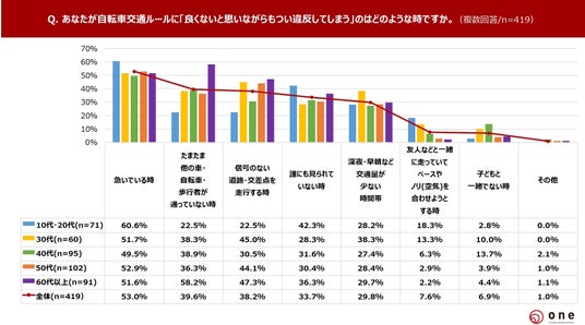 “つい違反”してしまうのは「急いでいる時」53.0%が最多。60代以上は「たまたま他の車・自転車・歩行者が通っていない時」58.2%が他の年代と比べて高いことが明らかに。