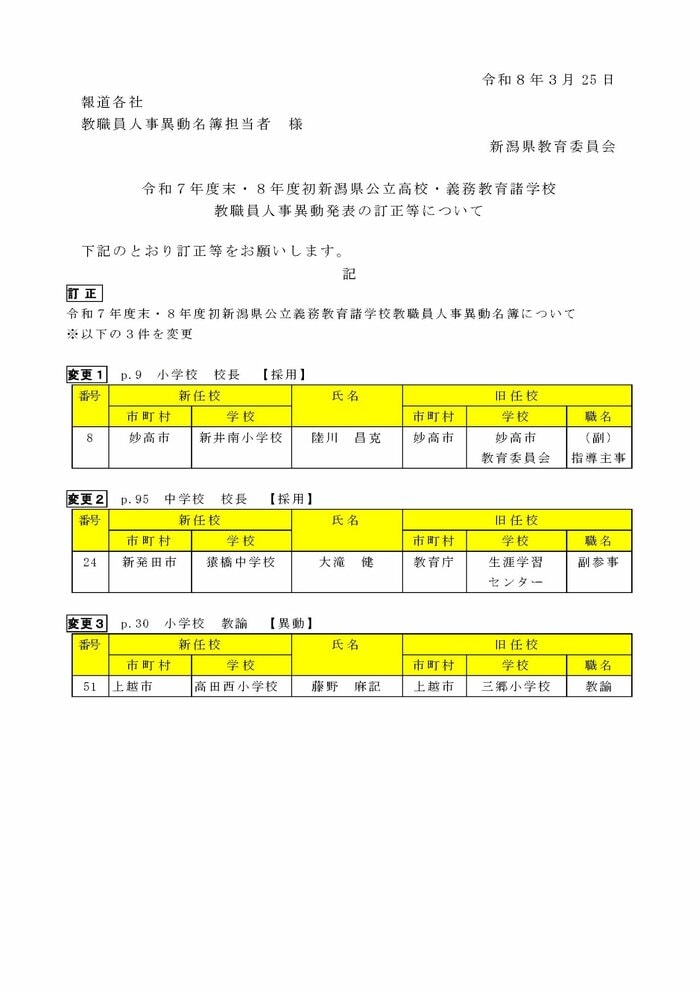 新潟県教育委員会は24日、教職員の人事異動について発表した。新潟市以外の義務教育校では約3200人が異動し、新採用職員は394人。上・中・下越・佐渡・新潟市間の異動は277人となっている。新潟市を除く県内の中学校の人事異動を紹介する。