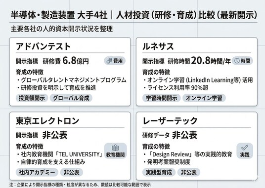 - 人材投資(研修・育成)は、定量開示の有無も含めて各社の色が分かれます。アドバンテストは研修費6.8億円を開示し、ルネサスは研修時間20.8時間/年とオンライン学習の利用率90%超を示しています。一方、東京エレクトロンとレーザーテックは研修データを非公表としつつ、社内教育機関や実践的教育制度を提示しています。