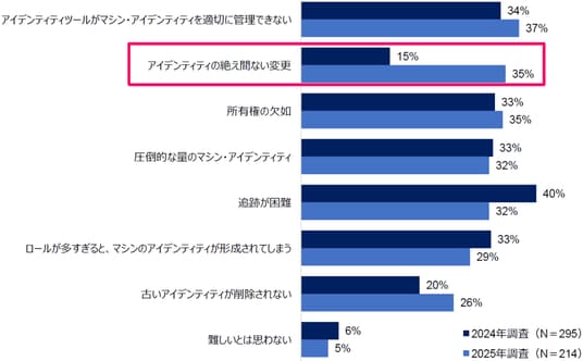 マシン アイデンティティ管理の難しさ(図6)について、「アイデンティティの絶え間ない変更」を挙げた企業は35%となり、前年の15%から20ポイント増加し、最も増加幅の大きい課題となりました。クラウド環境やIoT環境では、マシン アイデンティティの生成・変更・削除が継続的に発生しており、従来のIT資産管理や静的なアクセス管理では対応が困難な状況となっています。