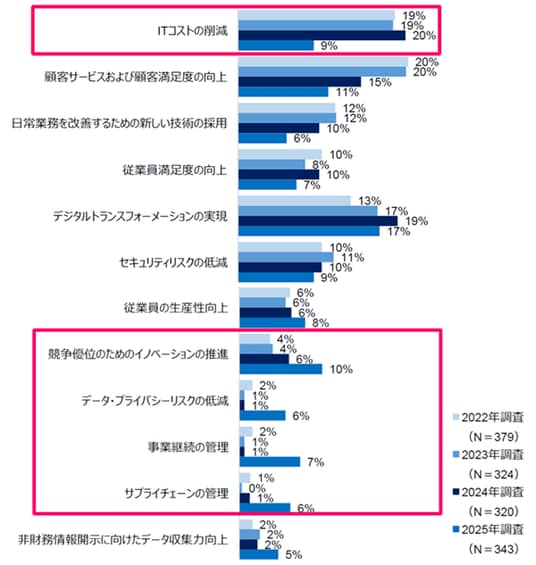 今後12カ月で最も優先するIT(図1)について、例年上位に位置していた「ITコストの削減」(9%)は、前年から11ポイント減と大きく下落しました。一方で、例年ほぼ最下位で変化がなかった「データ・プライバシーリスクの低減」(6%)「事業継続の管理」(7%)「サプライチェーンの管理」(6%)の3項目は、いずれも約5ポイント増加し、12項目中最も伸びました。これらは、予測困難な変化や攻撃への耐性を高めるための、セキュリティやレジリエンス強化に関するIT優先事項と見ることができます。