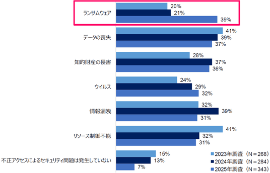 非正規社員および人以外のアクセス権管理に起因するセキュリティ問題(図4)では、「ランサムウェア」が39%と前年からほぼ倍増しており、これらのアイデンティティ管理の不備が重大なインシデントの要因となっている実態も明らかとなりました。