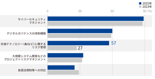 さらに、「デジタル人材に求められるスキルのうち、不足しているもの」への回答は、今回も「ビジネスアーキテクト」が最多となった。これは「AI人材」を上回っており、ビジネスとデジタルテクノロジーを橋渡しする高度な人材の育成が、依然として難易度の高い課題であることを示唆している。