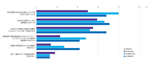 4.「生成AIの活用の課題」について、「データの未整備または不十分」と回答した企業は、「DX先進企業」で59%、「DXが推進できてない」と回答した「DX始動企業」では71%に上る。特にDX先進企業では、人材不足、ハルシネーション等の懸念を上回り、最も多く挙げられた課題となっている点が注目される。AI活用を見据えたデータ整備の取組みは広がりつつあり、今後は非定型データの活用や、企業固有の暗黙知をいかに取り込んでいくかが、重要なテーマになると考えられる。