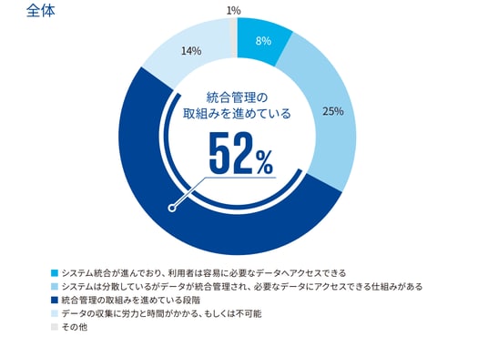 また、「データへのアクセスのしやすさ」への回答は、52%が「統合管理の取り組みを進めている」であり、14%が「データの収集に労力と時間がかかる、もしくは不可能」と回答。