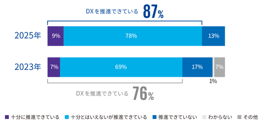 - 「DXを推進できている」と回答した企業が前回から11%増の87%である一方、「十分に推進できている」と回答した「DX先進企業」は2%増のわずか9%にとどまる。多くの企業で取組みが広がる一方で変革には至っておらず、“成果創出の壁”がある。