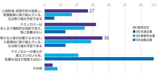 3.「AIによる人材戦略への影響」について、DX先進企業で最も多かった回答は、「新たな人員が必要となるため、人員増加に取り組んでいる」であり、「人員削減、採用方針の見直し、配置転換」を上回った。人の担ってきた業務の一部がAI へシフトすることは避けられないが、AIを活用してビジネス価値を創出できる人材の重要性が一層高まっている。
