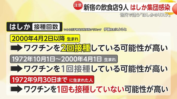 伊藤院長によると、2000年の4月2日以降に生まれた人はワクチンの定期接種を2回受けている可能性が高い一方で、1972年10月1日から2000年4月1日までに生まれた人は1回接種、それより前に生まれた人は1回も接種していない可能性が高いという。