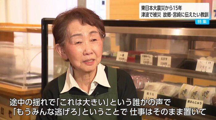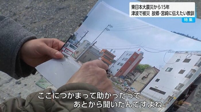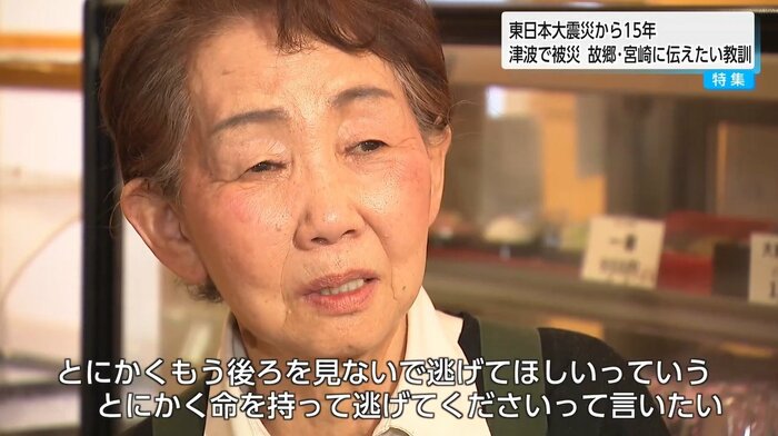 東日本大震災から15年が経過した。宮城県気仙沼市で60年以上暮らす宮崎県川南町出身の女性は、最大20メートルを超える大津波と、夜空を赤く染めた火災を経験。「とにかく命を持って逃げてほしい」。故郷・宮崎県が南海トラフ巨大地震で最大17メートルの津波に襲われると想定される中、何よりも命を優先した避難の重要性を訴えている。