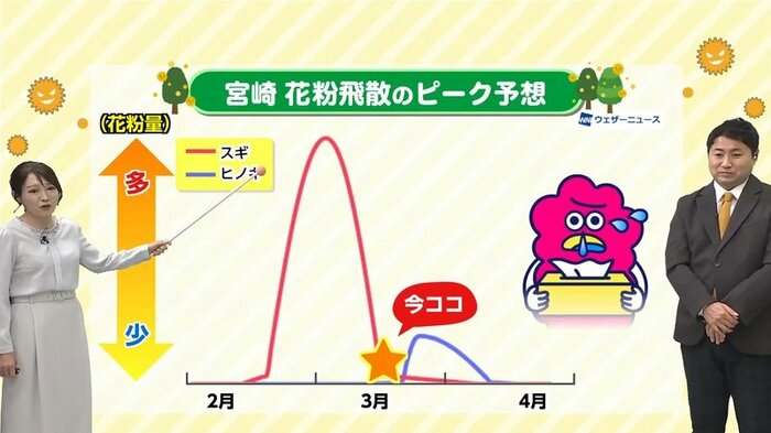 現在、スギ花粉は飛散のピークを越えつつありますが、入れ替わるようにヒノキ花粉の飛散が始まっています。4月にかけて注意が必要な時期が続きますので、万全の対策を心がけましょう。