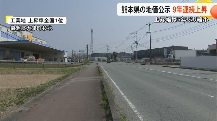 用途別では住宅地が2.8%、商業地が3.4%、工業地が9.1%とそれぞれ上昇していて、中でも工業地では大津町の調査地点でプラス26.0%となり上昇率全国1位となりました。