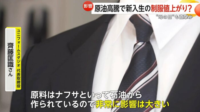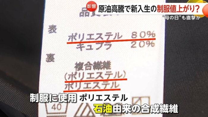 制服の生地の多くは、丈夫で軽い「ポリエステル」が使われている。これは石油由来の合成繊維のため、今後、原油高騰の直撃を受ける恐れがある。