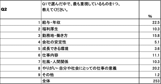 一方で問2では複数回答した中で最も重視する項目を回答するアンケートを取りました。すると「やりがい・自分や社会にとっての仕事の意義」と回答した学生は20.2%となり、9項目中2位となっています。