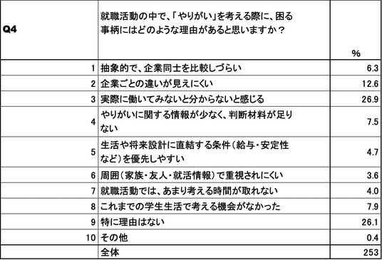 この問1・問2のねじれから就職活動において「やりがい・自分や社会にとっての仕事の意義」を重視することは、一部の学生であるものの、その一部の学生にとってはとても重要な事柄だということが読み取れました。やりがいを重視する学生の、やりがいへの本気度は本物だと捉えられます。