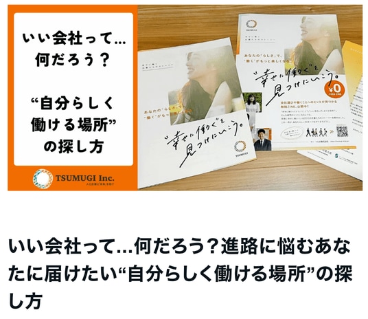 葬祭業にむけ人事コンサルティングや広報支援といったサービスを通して企業様が“いい会社”となるサポートを行っている、つむぎ株式会社(本社:東京都、代表取締役:前田亮)(以下・つむぎ)は就職活動を控える大学生に向け、やりがいのある働き方を伝えるため、【“働く”がちょっと楽しみになるZINE『“幸せに働く”を、見つけにいこう。』】を発行しました。