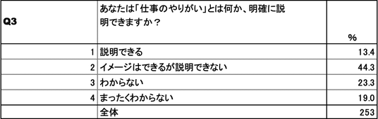 問3においてやりがいについて説明できるか質問したところ、「はっきりと説明できる」とした学生は13.4%に留まりました。もっとも多かった回答は「イメージはできるが説明できない」で44.3%でした。
