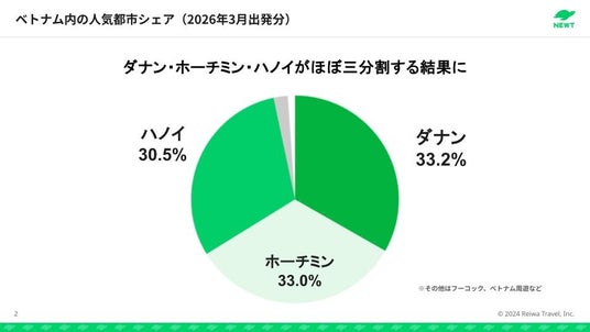 さらに、ベトナム旅行の都市別内訳を見ると、ダナン(33.2%)、ホーチミン(33.0%)、ハノイ(30.5%)と、特定の都市に偏ることなく、人気が分かれる結果となりました。